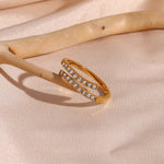 The Celestine Diamond Ring is a celestial masterpiece. This stunning ring features a delicate open-ended design made of 18k gold and embedded with AAAAA diamond simulants that sparkle and shine like real diamonds. The Celestine Diamond Ring is the perfect way to elevate your look and add a touch of luxury to your everyday style.